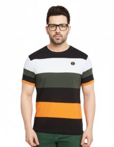 Men’s Striped Cotton T-Shirt – Black, White, Green & Orange – Size S
