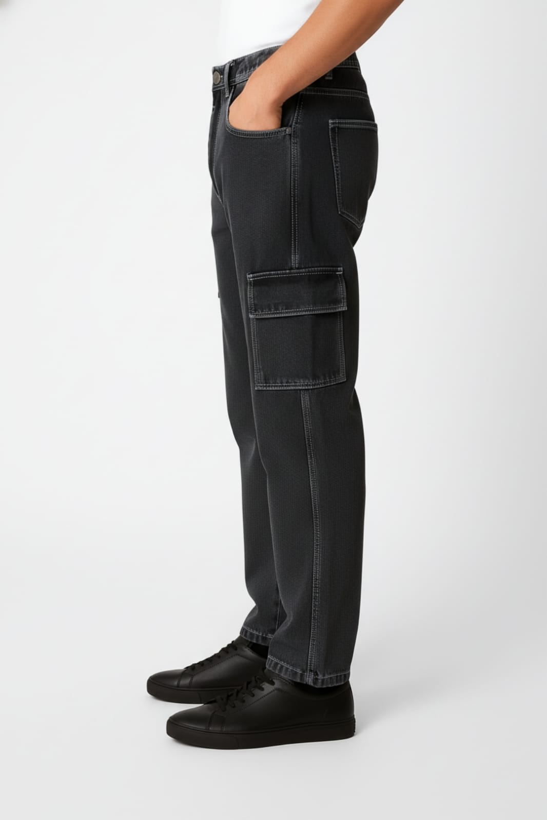 Add a versatile, edgy piece to your rotation with these Men’s Washed Black Denim Cargo Jeans. They combine the comfort and resilience of classic denim with the practical, modern look of cargo styling.